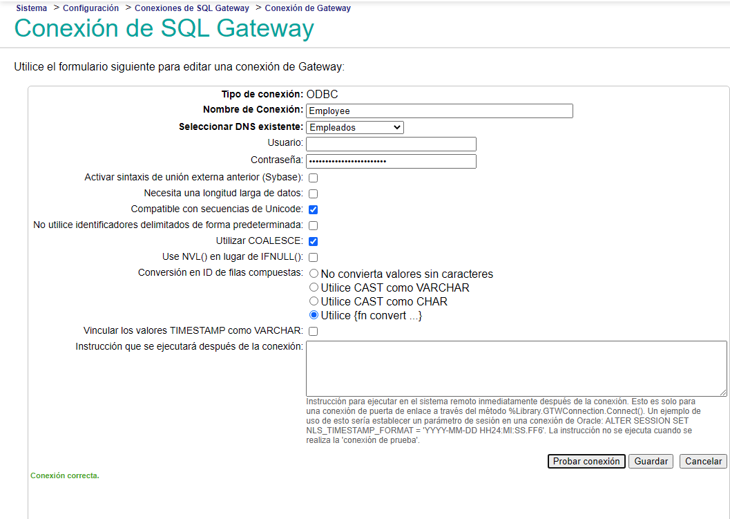 Para este ejemplo, usamos conexión ODBC aprovechando la conexión realizada desde el DSN de sistema de Windows (Empleados). Creamos una conexión (botón "Crear nueva conexión") de SQL Gateway para IRIS, y en este ejemplo la nombraremos "Employee", y desde la misma creación podemos "probar" la conexión de modo que se mostrará algo como en la imagen: