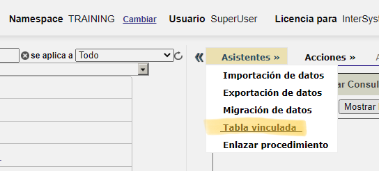Asegurarse trabajar en un Namespace al que podamos tener acceso y crear paquetes y clases. En la ventana central, accedemos al menú "Asistentes --> Tabla vinculada":