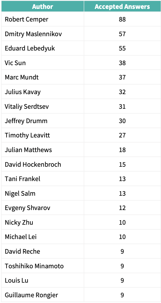 Autores que consiguieron el mayor número de "Respuestas aceptadas" durante el año 2021.