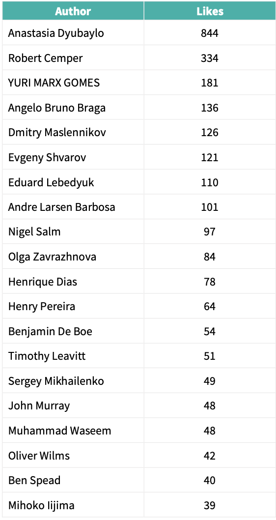 Autores cuyas publicaciones y respuestas obtuvieron el mayor número de votos en la Comunidad de Desarrolladores durante el año 2021.