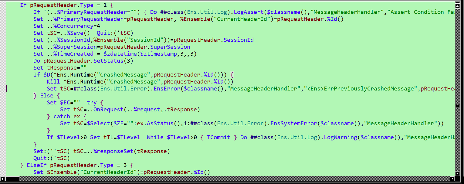 En la imagen de la traza, pone que falla en la línea 16 del método: "Stack When Logged: $$^MessageHeaderHandler+16^St.Vectorsearch.Demo.BP.Feeling.1 +1".