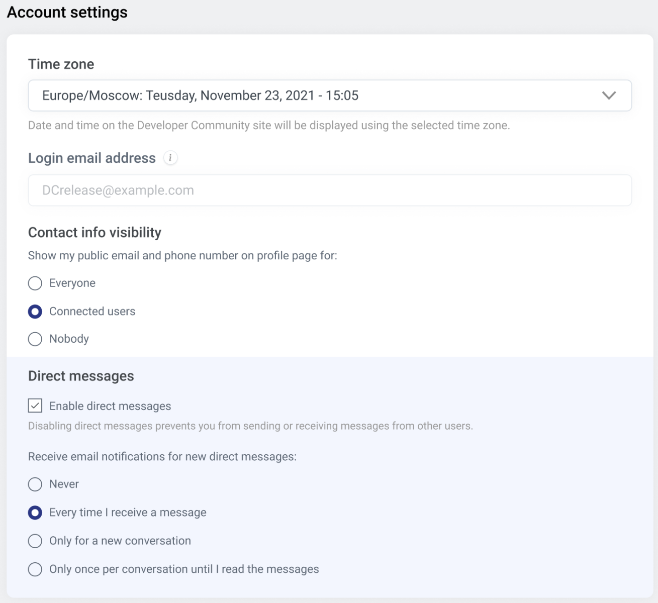 En la "Configuración de la cuenta", puedes especificar tu zona horaria, a quién quieres que se muestre tu información de contacto y también configurar las notificaciones de los Mensajes Directos.