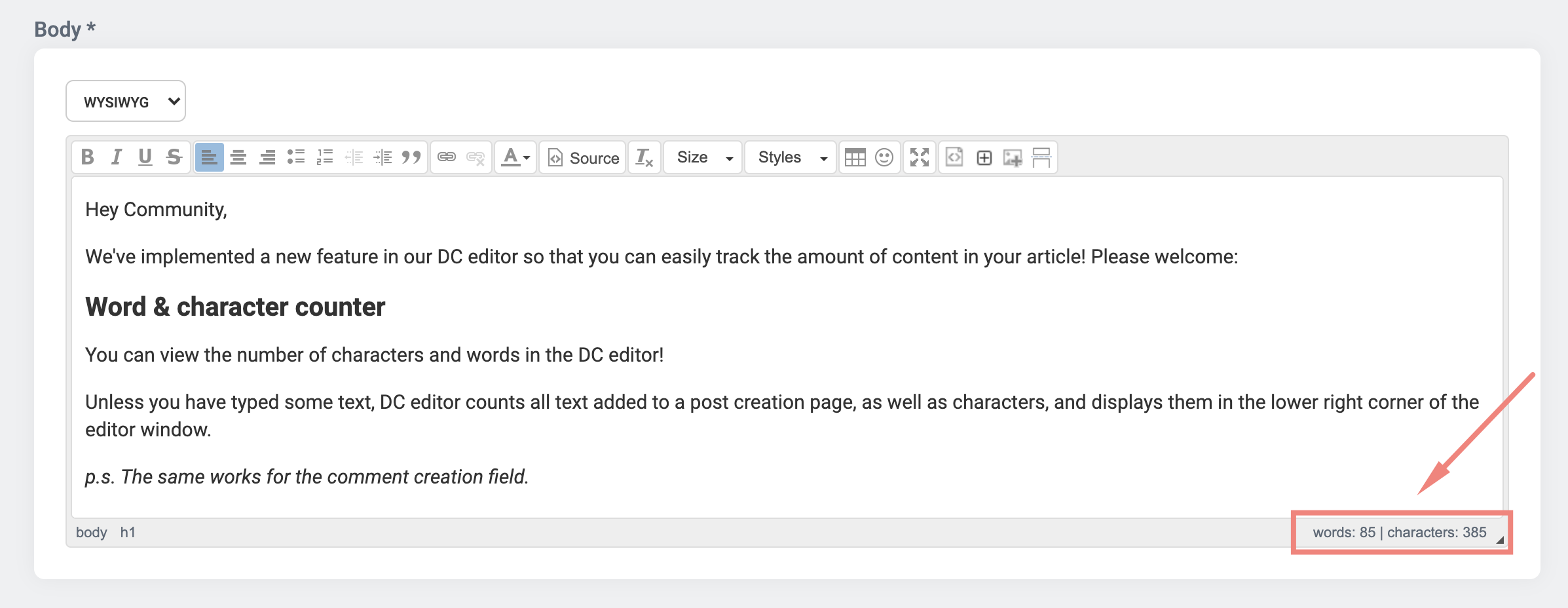 Hemos implementado un contador de caracteres y palabras en el editor de la Comunidad, para poder controlar fácilmente la cantidad de contenido de cada publicación.