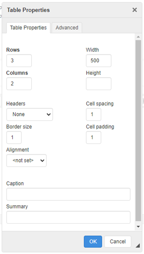 Al hacer clic en el botón "More" (Más) se abre una ventana para configurar las propiedades de la tabla.