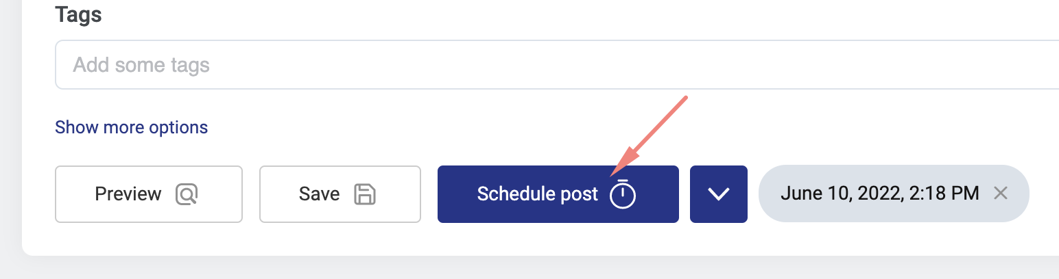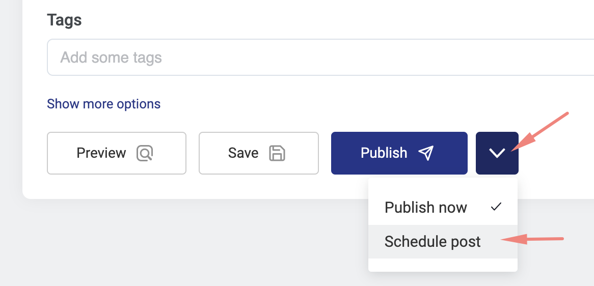 Para programar una publicación, solo hay que hacer clic en la flecha hacia abajo al lado del botón "Publicar" y elegir "Programar publicación".