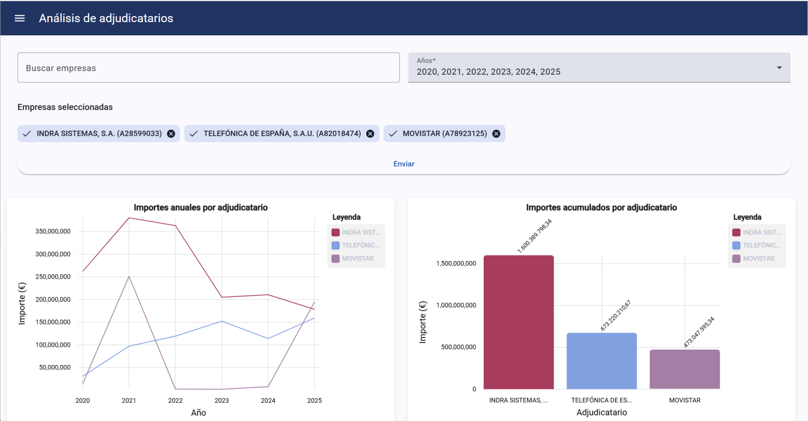 De tal forma que podremos buscar agilmente y con absoluta inmediatez los importes de adjudicaciones agregadas tanto por empresas ganadoras, organismo contratante y años de publicación.