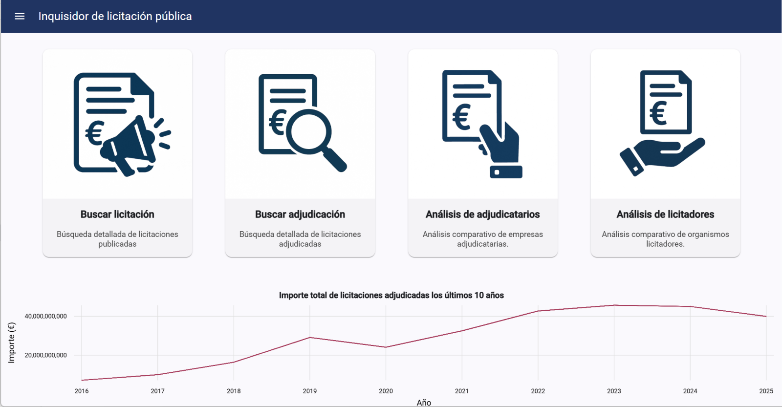 El Inquisidor se conecta diariamente a la URL que descarga el fichero y lo mapea a su propia base de datos, extrayendo los datos más útiles de la misma, como es la descripción, el importe, fechas de publicación así como el ganador de la misma y el importe en el caso de estar adjudicadas.