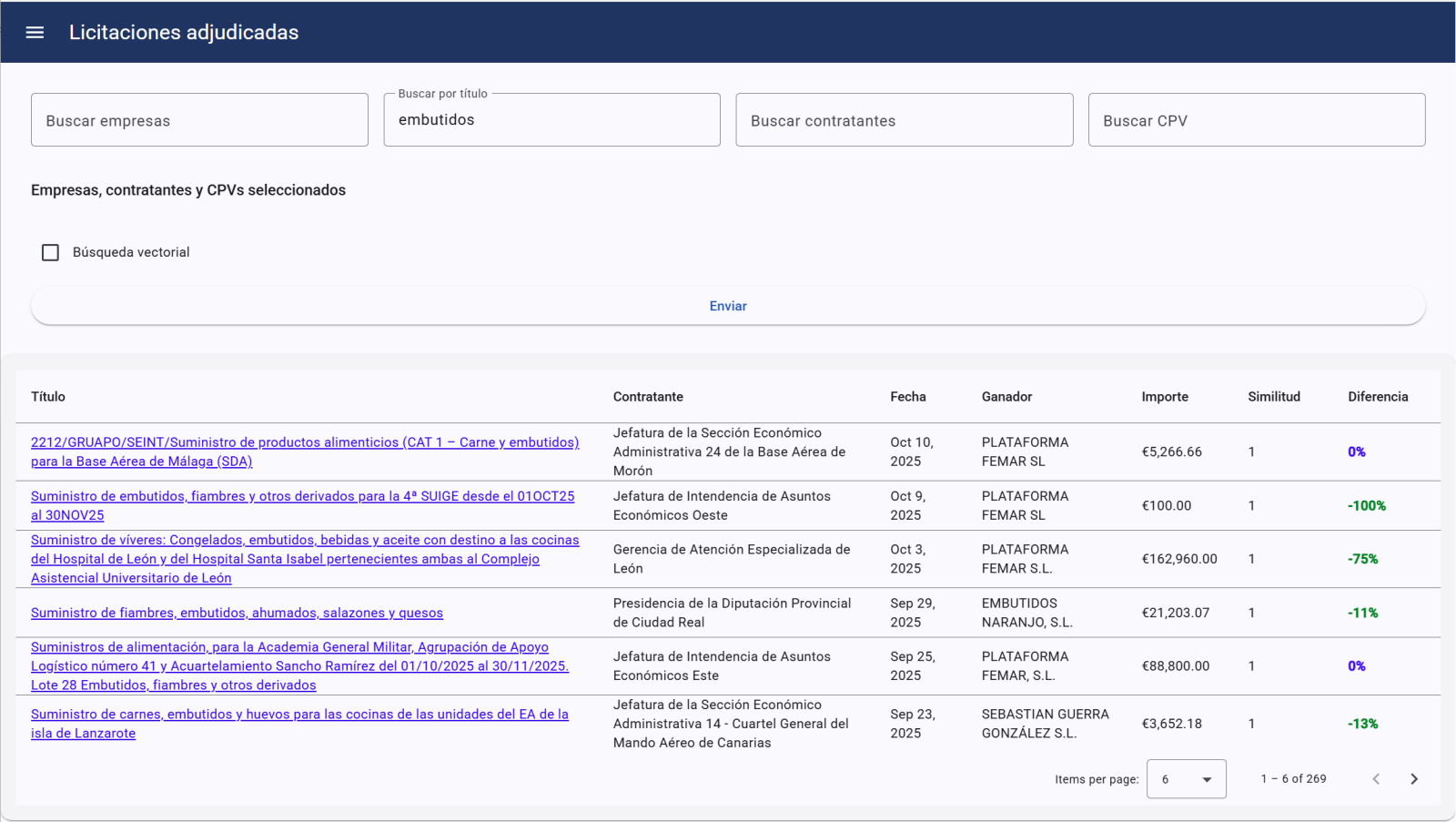 En ocasiones es posible que no estemos totalmente seguros de la descripción usada para el título de las licitaciones, por ello hemos aprovechado las capacidades de almacenamiento vectorial de la base de datos para la vectorización de los títulos y permitir búsquedas basadas en proximidad vectorial, obteniendo resultados que se aproximen a la búsqueda realizada.