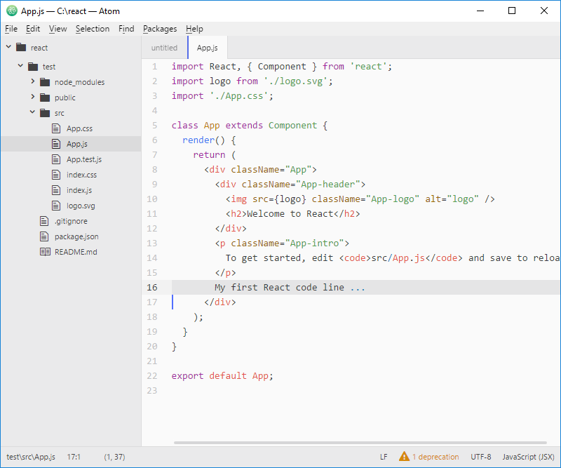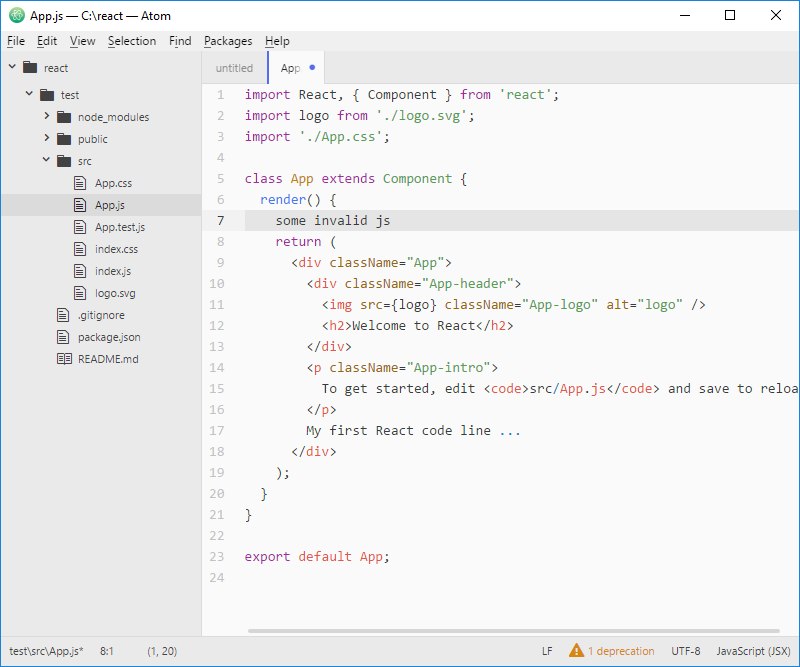 En tu editor Atom, ve a la pestaña File, después a Settings y selecciona +Install. Busca el paquete correspondiente a "react" en la comunidad e instálalo. Este paquete sabe todo lo que hay que saber sobre la sintaxis JSX en React, con énfasis en la sintaxis.