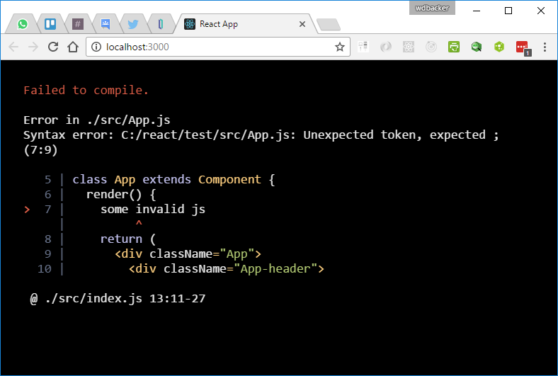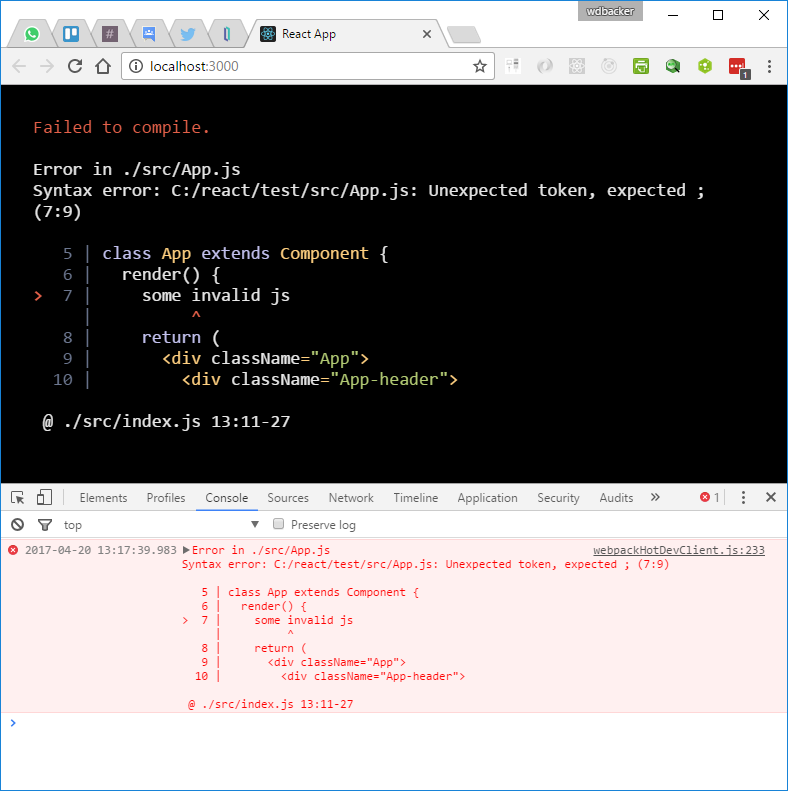 Ahora provoquemos un error en el código fuente al añadir algún JavaScript que no sea válido dentro del método render():
