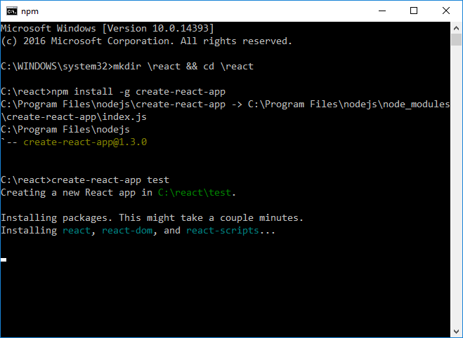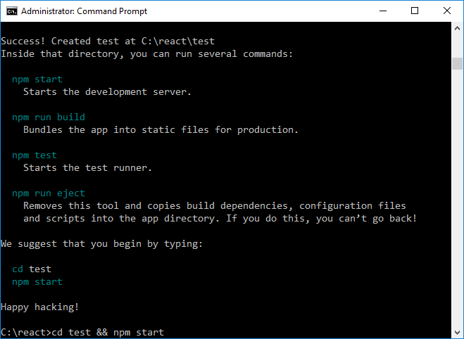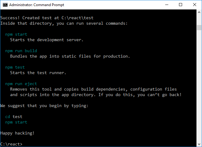 Verás que se creó un directorio de la aplicación para ti (C:\react\test) y que también se descargan e instalan un montón de módulos del nodo (npm) en este subdirectorio de la prueba. No te asustes, la mayoría de estos módulos solamente son importantes para el desarrollo, ¡no son necesarios en producción!