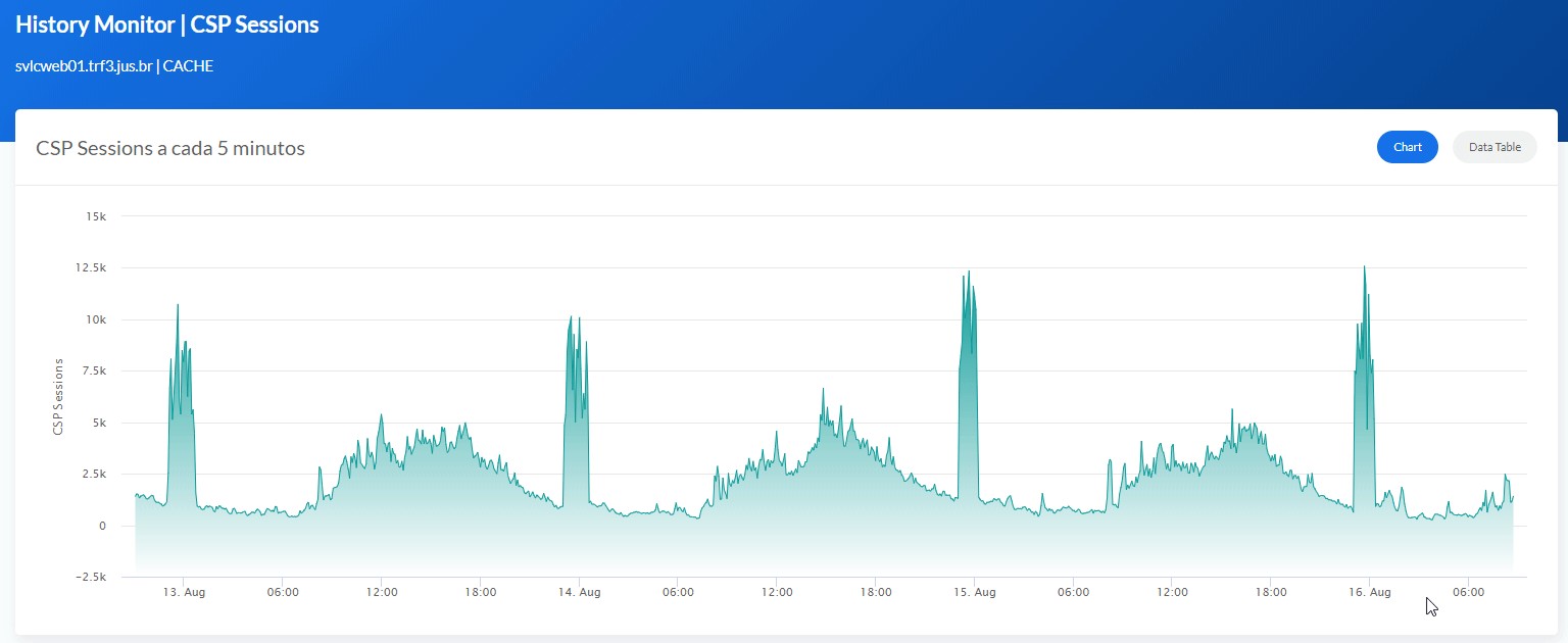 El "History Monitor" para Sesiones CSP y Licencias muestran la información entre tres secciones: