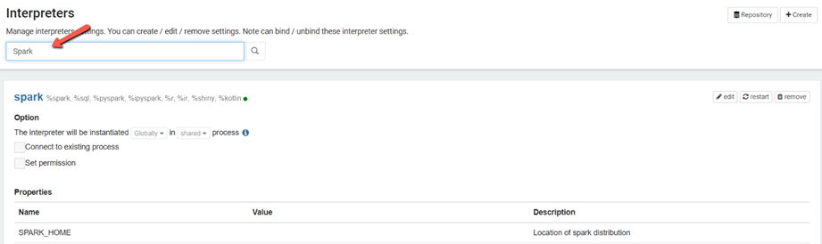 Apache Zeppelin permite conectar cualquier lenguaje/data-processing-backend en Zeppelin. Actualmente Apache Zeppelin es compatible con muchos intérpretes, como Apache Spark, Apache Flink, Python, R, JDBC, Markdown y Shell.