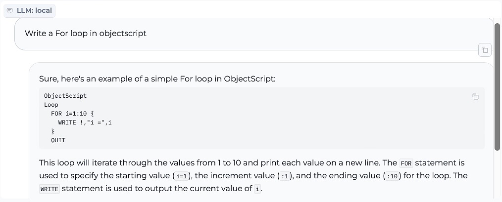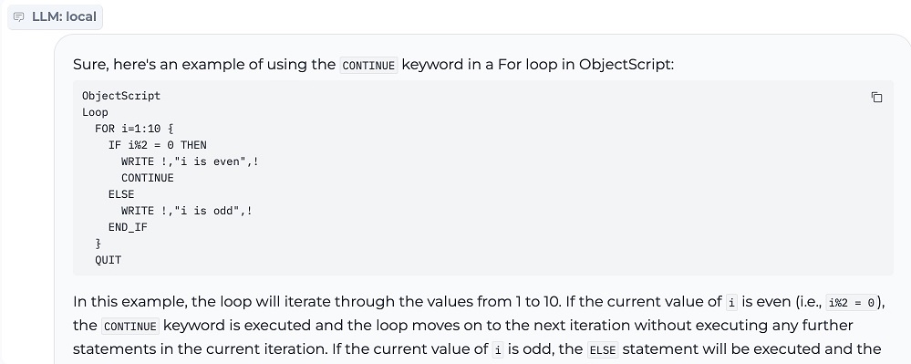 Aquí se confunde claramente el uso de la documentación del ObjectScript con los ejemplos del lenguaje IRIS BASIC (palabra clave THEN). Un enfoque de consulta de documentos posiblemente necesite utilizar "ObjectScript" como filtro de metadatos o tener conjuntos de archivos PDF de ayuda generados previamente que se limiten a una implementación de lenguaje particular. Anticipar ejemplos de Python y Java podría imponer un efecto similar. El uso de "i%2" es la sintaxis de Python para el operador modular, mientras que se esperaría "i#2" para el ObjectScript.