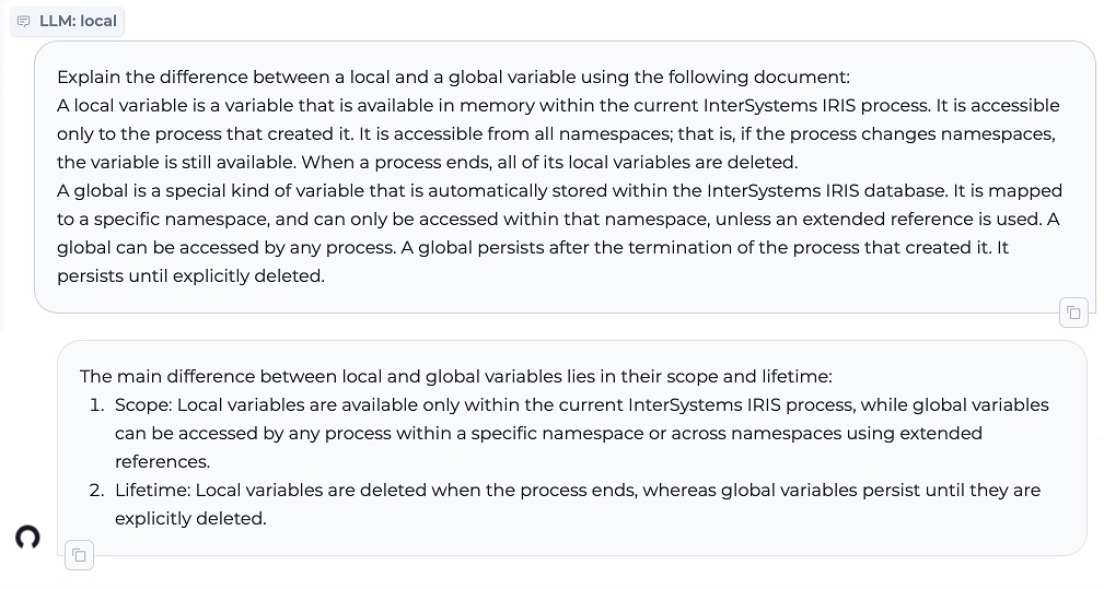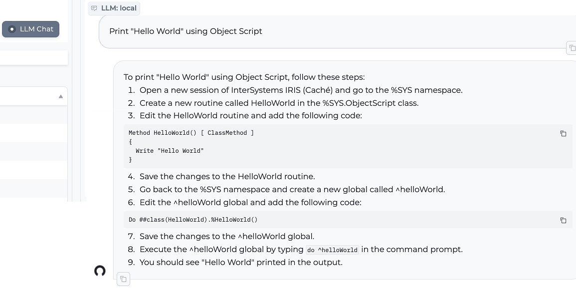 # install developer tools xcode-select --install # create python sandbox mkdir PrivateGTP cd privateGTP/ python3 -m venv . # actiavte local context source bin/activate # privateGTP uses poetry for python module management privateGTP> pip install poetry # sync privateGTP project privateGTP> git clone https://github.com/imartinez/privateGPT # enable MPS for model loading and processing privateGTP> CMAKE_ARGS="-DLLAMA_METAL=on" pip install --force-reinstall --no-cache-dir llama-cpp-python privateGTP> cd privateGPT # Import configure python dependencies privateGTP> poetry run python3 scripts/setup # launch web interface to confirm operational on default model privateGTP> python3 -m private_gpt # navigate safari browser to http://localhost:8001/ # To bulk import documentation needed to stop the web interface as vector database not in multi-user mode privateGTP> [control] + "C" # import some PDFs privateGTP> curl "https://docs.intersystems.com/irislatest/csp/docbook/pdfs.zip" -o /tmp/pdfs.zip privateGTP> unzip /tmp/pdfs.zip -d /tmp # took a few hours to process privateGTP> make ingest /tmp/pdfs/pdfs/ # launch web interface again for query documentation privateGTP> python3 -m private_gpt