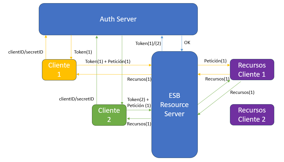 Partimos de un servidor de autenticación (puerta de entrada) y un servidor de Recursos (la vivienda). En el servidor de autenticación vamos a tener 2 clientes dados de alta, cada uno con su usuario y su contraseña. Por otro lado, nuestro ESB que hace de servidor de recursos tendrá la labor de consultar los recursos determinados (habitaciones) para cada cliente. Por lo tanto, tenemos: