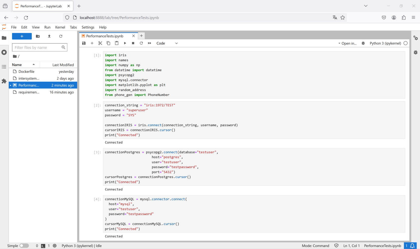 Poco después @Dmitry Maslennikov me dijo "¿Por qué no pruebas desde un proyecto en Python?" pues bien, aquí está la versión en Python de las pruebas que realizamos mediante las conexiones JDBC previamente.