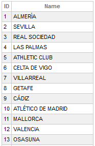 De cara a facilitar un posterior mantenimiento de los datos comunes así como mejorar el desempeño del modelo de predicción hemos definido 2 tablas maestras en las que almacenaremos los equipos y los árbitros. Estas tablas únicamente constarán de la columna con el identificador del registro y el nombre. Echemos un vistazo a ambas:
