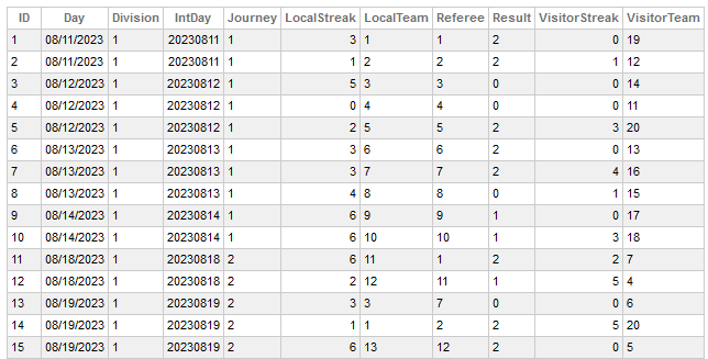 INSERTINTO QUINIELA_Object.MatchTrain (Day, Division, Journey, LocalTeam, Referee, Result, VisitorTeam, IntDay) SELECTTO_DATE(RM.Day,'DD/MM/YYYY') AS DayTransformed, RM.Division, RM.Journey, LT.ID as LocalTeam, R.ID as Referee, CASEWHENCAST(RM.GoalsLocal AsINTEGER) > CAST(RM.GoalsVisitor AsINTEGER) THEN1WHENCAST(RM.GoalsLocal AsINTEGER) < CAST(RM.GoalsVisitor AsINTEGER) THEN2ELSE0ENDasResult, VT.ID as VisitorTeam, CAST({fn CONCAT({fn CONCAT(SUBSTR(RM.Day,7,4),SUBSTR(RM.Day,4,2))},SUBSTR(RM.Day,1,2))} AsINTEGER) as IntDay FROM QUINIELA_Object.RawMatch RM LEFTJOIN QUINIELA_Object.Team LT ONUPPER(RM.LocalTeam) = UPPER(LT.Name) LEFTJOIN QUINIELA_Object.Team VT ONUPPER(RM.VisitorTeam) = UPPER(VT.Name) LEFTJOIN QUINIELA_Object.Referee R ONUPPER(RM.Referee) = UPPER(R.Name)Para ello sustituimos el literal con el nombre del árbitro y de los equipos por su referencia en las tablas maestras. También obtenemos el resultado a partir de los goles del partido, 0 para el empate, 1 para la victoria local y 2 para la visitante. Esta columna Result será la que defina nuestro modelo de predicción como un modelo de clasificación, es decir, cada partido pertenecerá a una de nuestras 3 clases (1, X o 2).