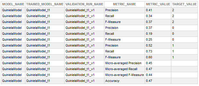 SELECT * FROM INFORMATION_SCHEMA.ML_VALIDATION_METRICSCon esta consulta obtendremos las siguientes métricas: