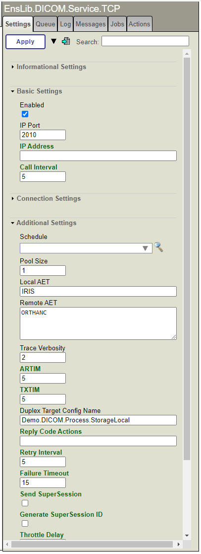 En nuestro ejemplo lo que haremos será configurar nuestra producción de IRIS for Health para que reciba vía TCP/IP las imágenes que sean remitidad desde nuestro PACS. Para ello deberemos incluir un Business Service de la clase estándar EnsLib.DICOM.Service.TCP que nos permitirá configurar dichas recepciones. Echemos un vistazo a la configuración del mismo:
