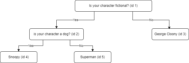 Necesitamos una característica que nos diferencie de Superman, en este caso preguntaremos «¿Tu personaje es un perro?», entonces, la respuesta afirmativa sería “Snoopy” y la negativa «Superman».