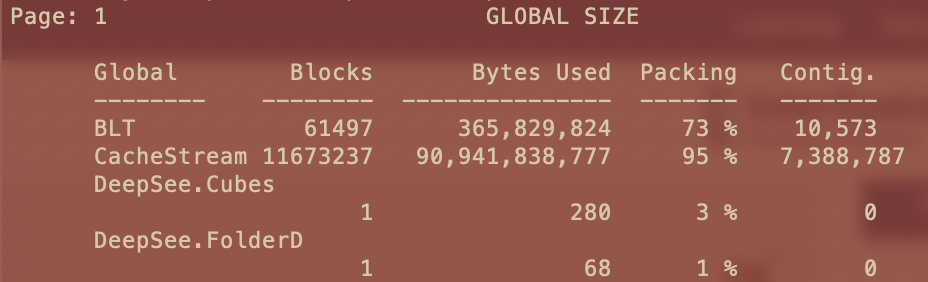 Esto me dio una idea directa de que la global ^CacheStream estaba ocupando demasiado espacio comparándola con el tamaño total de la base de datos.