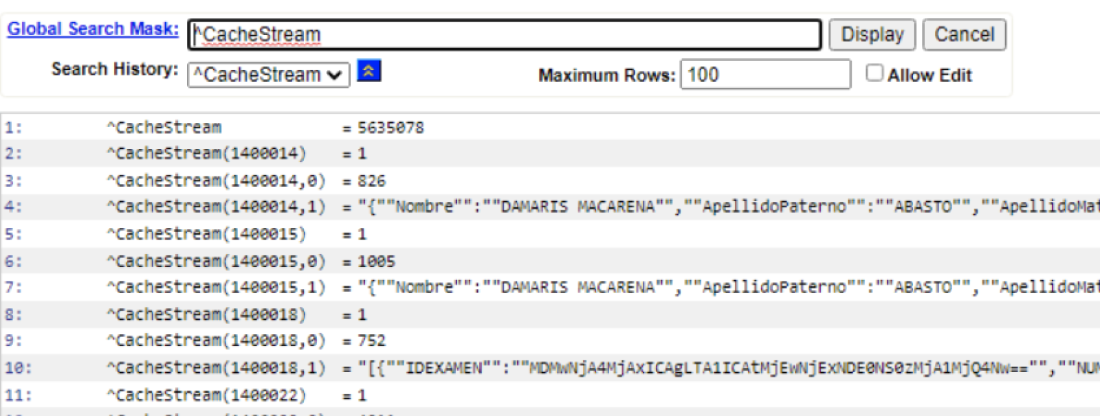 } Sin embargo, encontré a través de una inspección de la global ^CacheStream, cadenas de texto que deberían estar en las globales dedicadas a stream de sus respectivas clases.