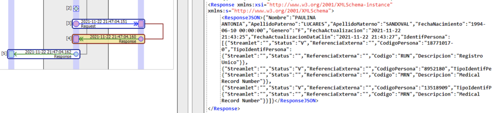 En este caso de uso, la propiedad ResponseJSON era un stream que representaba el resumen clínico de un paciente (en formato JSON). Era el stream mas largo de entre los diferentes casos de uso. Los eventos [4] y [5] contenían exactamente el mismo JSON, dado que el Business Process (BP) no realizaba ninguna acción sobre dicho stream, sino que simplemente traspasaba el contenido entre el response del BP hacia el response del Business Operation (BO). Además este JSON se guarda en una tabla de bitácora propia de la solución.