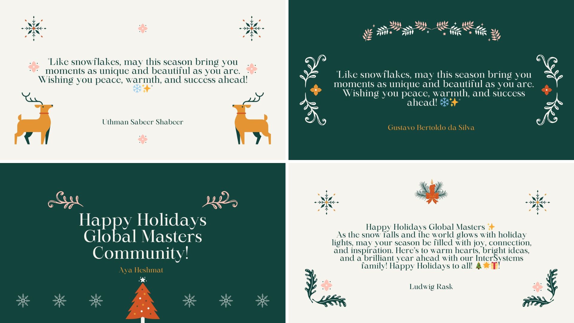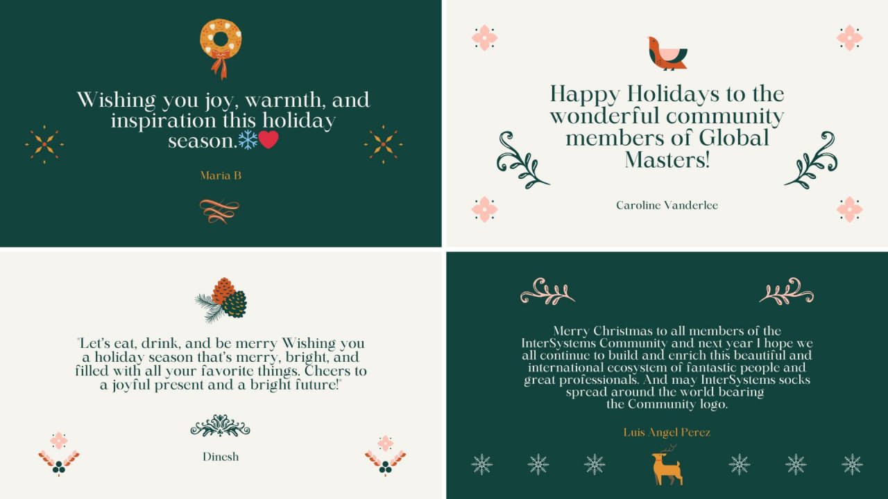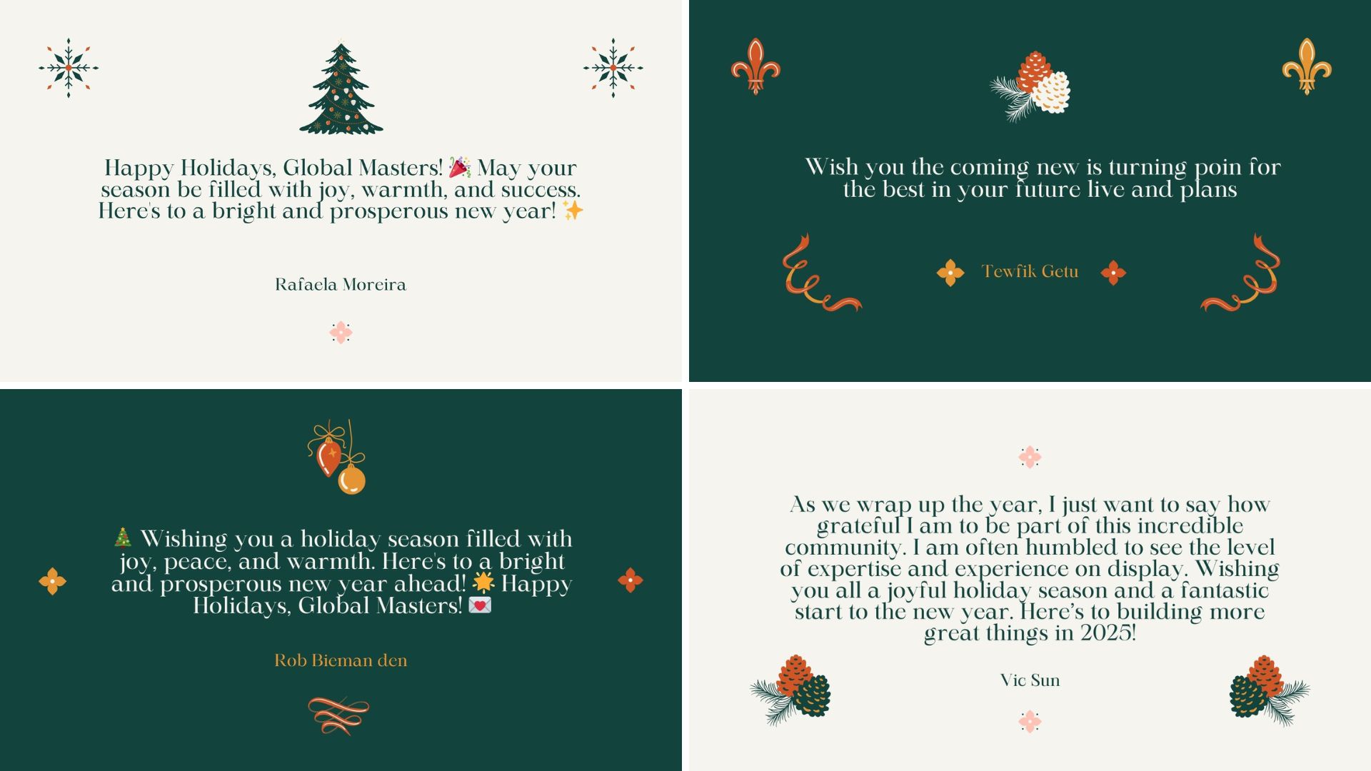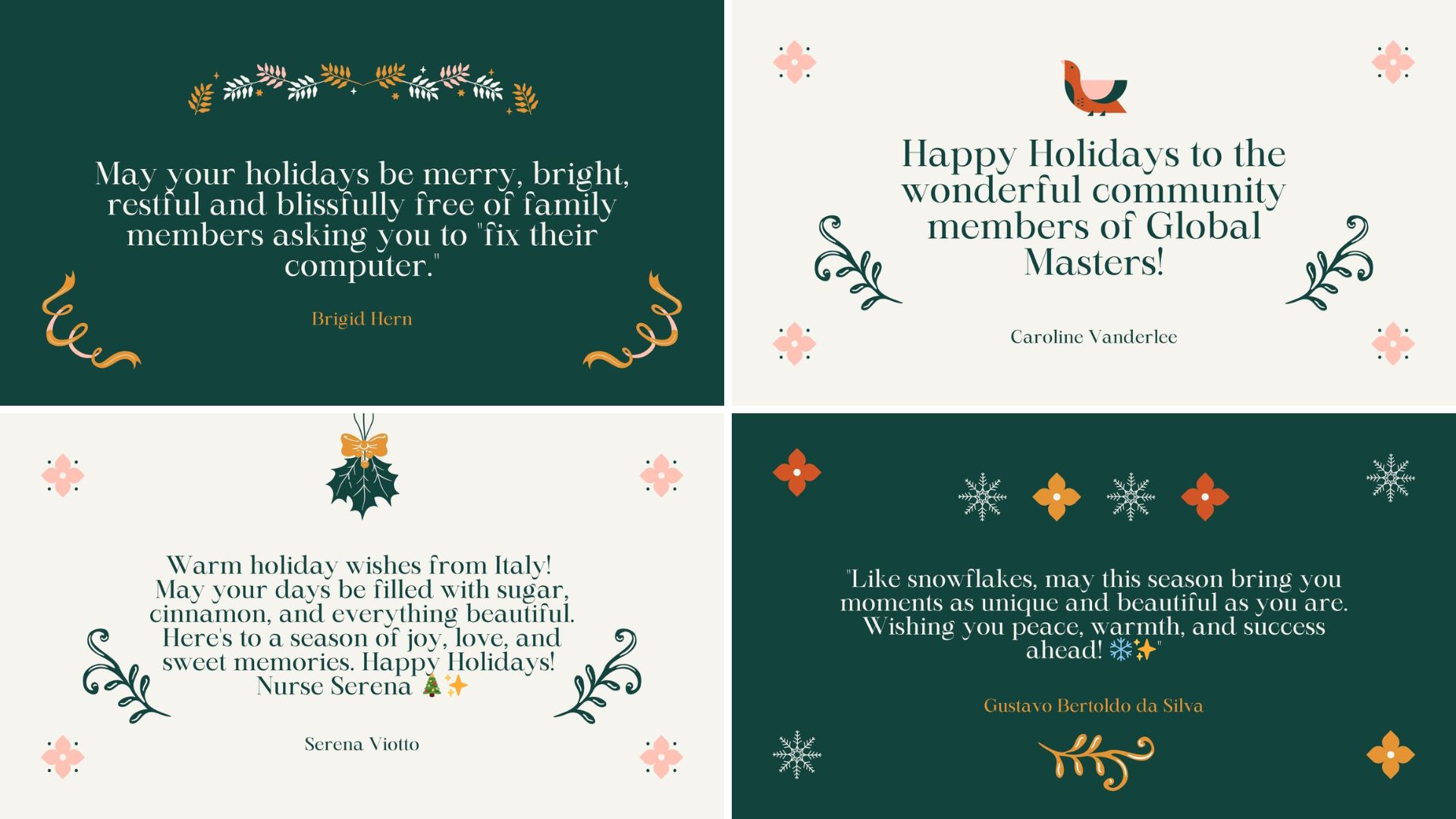 En Global Masters, nos habéis enviado maravillosas felicitaciones para la comunidad, ¡y estamos deseando compartirlas con todos! Hemos transformado vuestras felicitaciones en unas preciosas tarjetas navideñas: echadles un vistazo a continuación 💌. ¡Gracias a todos por vuestras cálidas palabras!