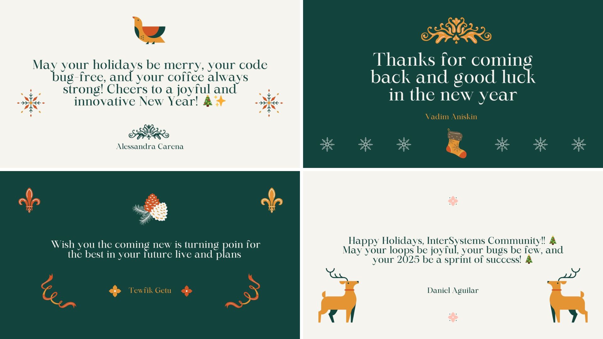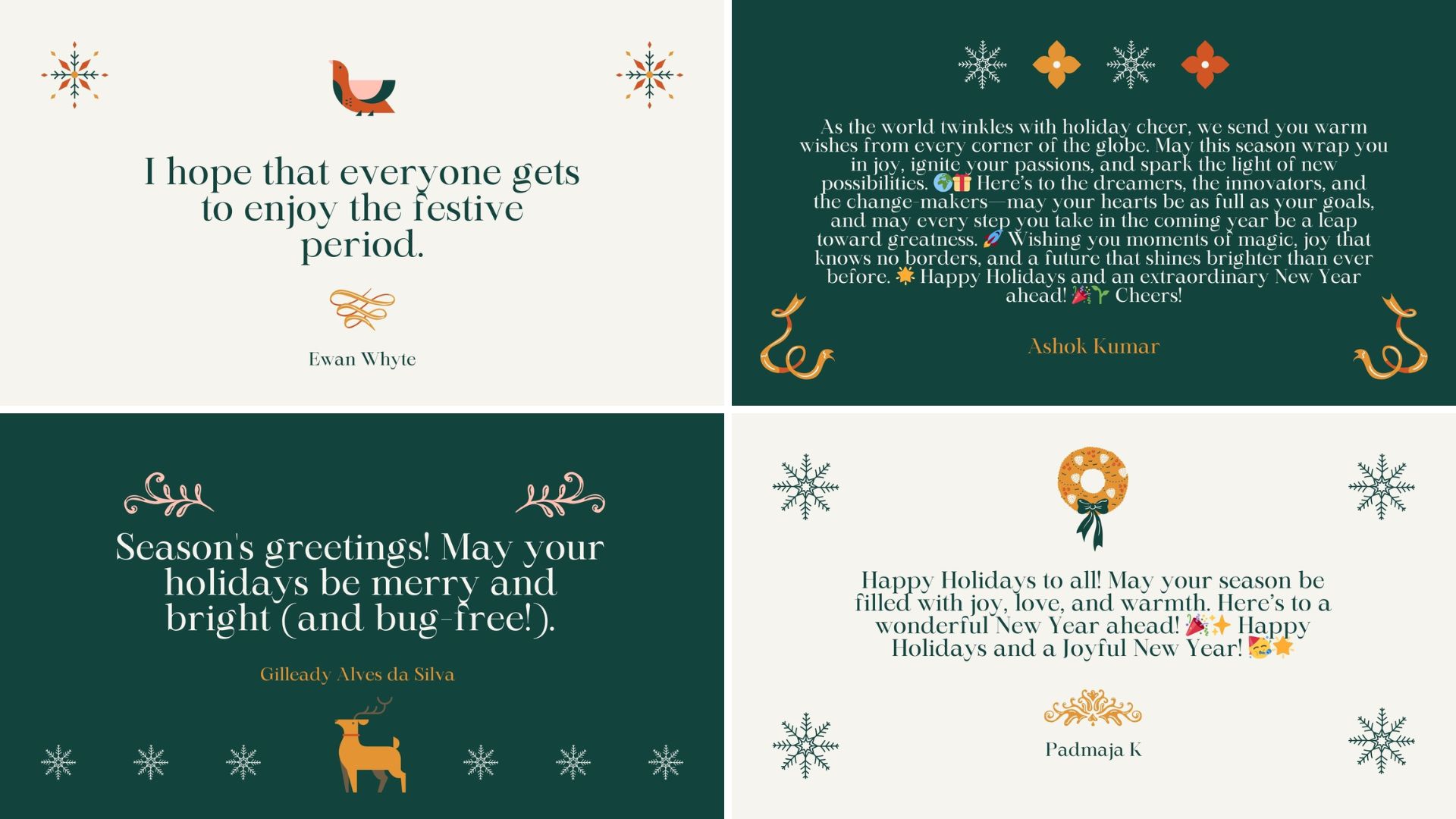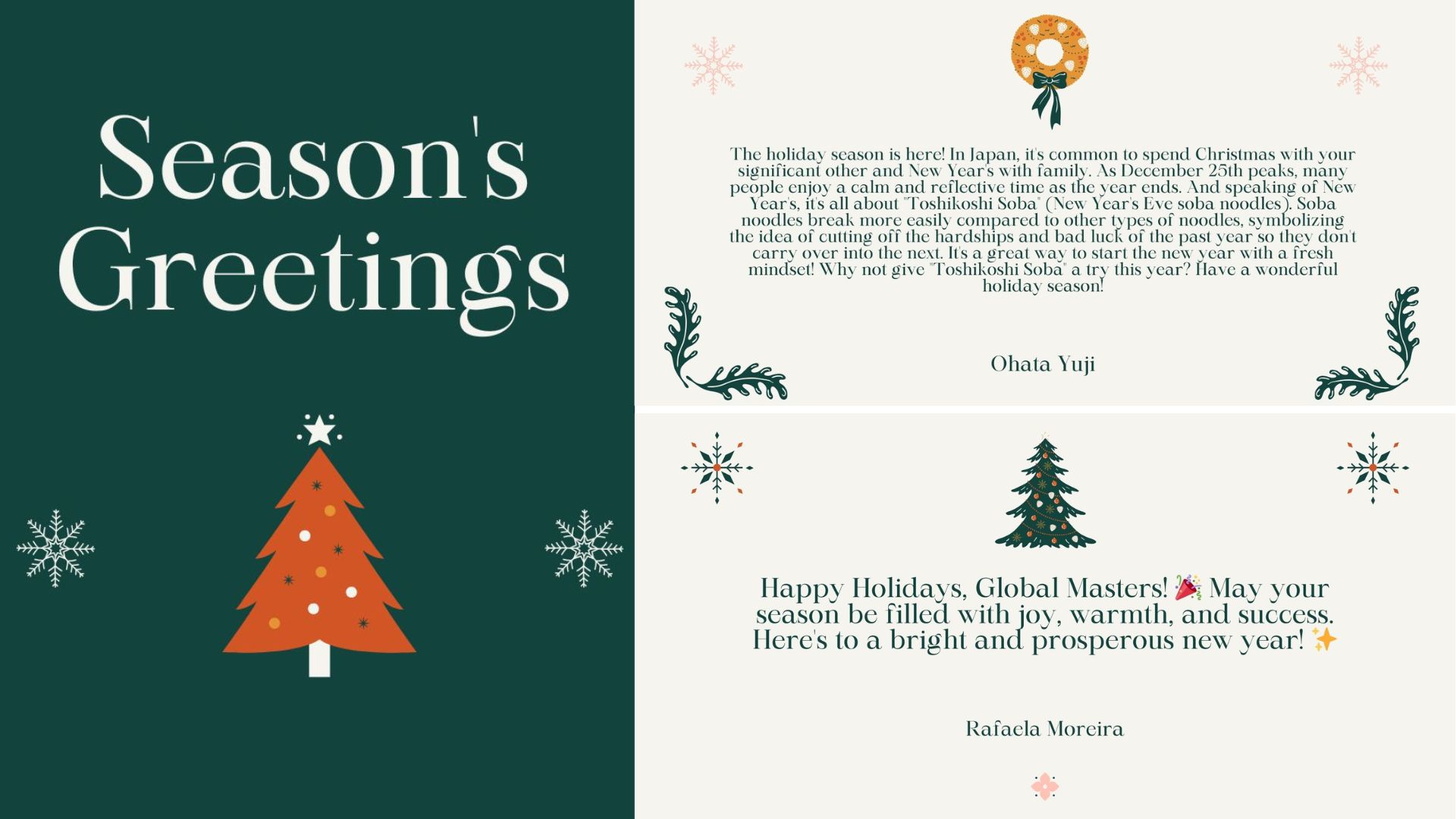 En Global Masters, nos habéis enviado maravillosas felicitaciones para la comunidad, ¡y estamos deseando compartirlas con todos! Hemos transformado vuestras felicitaciones en unas preciosas tarjetas navideñas: echadles un vistazo a continuación 💌. ¡Gracias a todos por vuestras cálidas palabras!