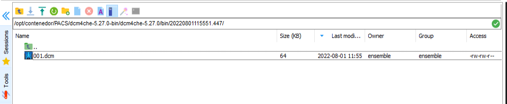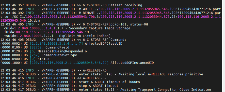 Enviamos el mismo fichero tal cual, recibiéndolo en el Servidor Destino que simulamos mediante dcm4che y comando: