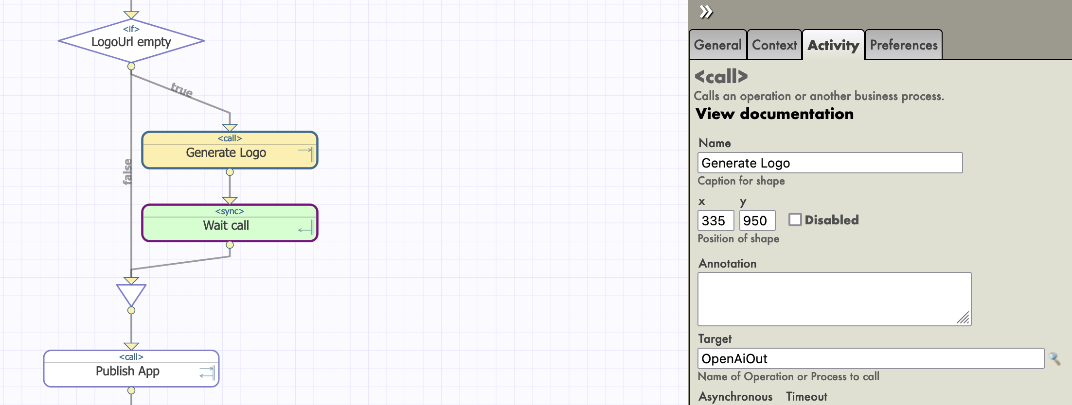 Сonfigurar el siguiente elemento <call>, hacer un objetivo nuestra operación OpenAiOut también.