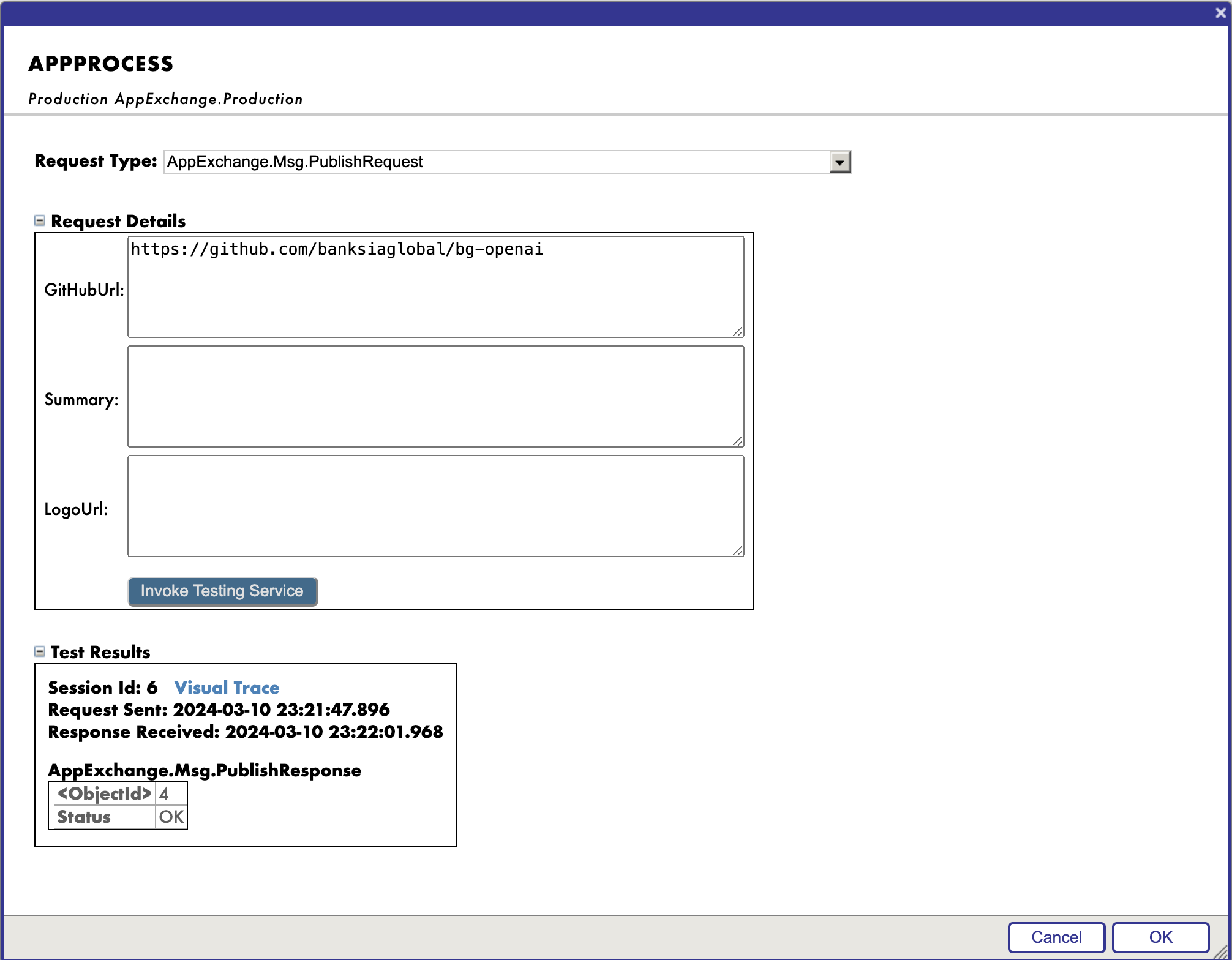 Nuestra aplicación, AppExchange, emula la publicación en OpenExchange de InterSystems: recibe una solicitud con una descripción del proyecto, el logotipo del proyecto y la URL de GitHub y la publica en el repositorio de AppExchange.