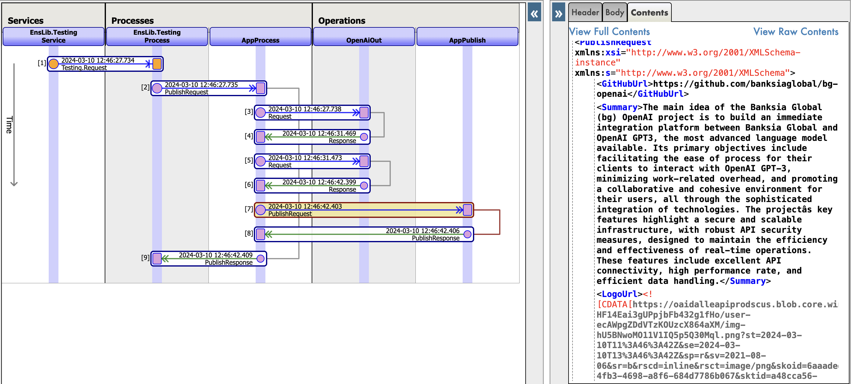 Verifica que la respuesta de la API de OpenAI es recibida y procesada correctamente por la aplicación. Ve a  Visual Trace para ver el ciclo completo de la aplicación y asegúrate de que se transmiten los datos correctos en cada elemento del proceso.