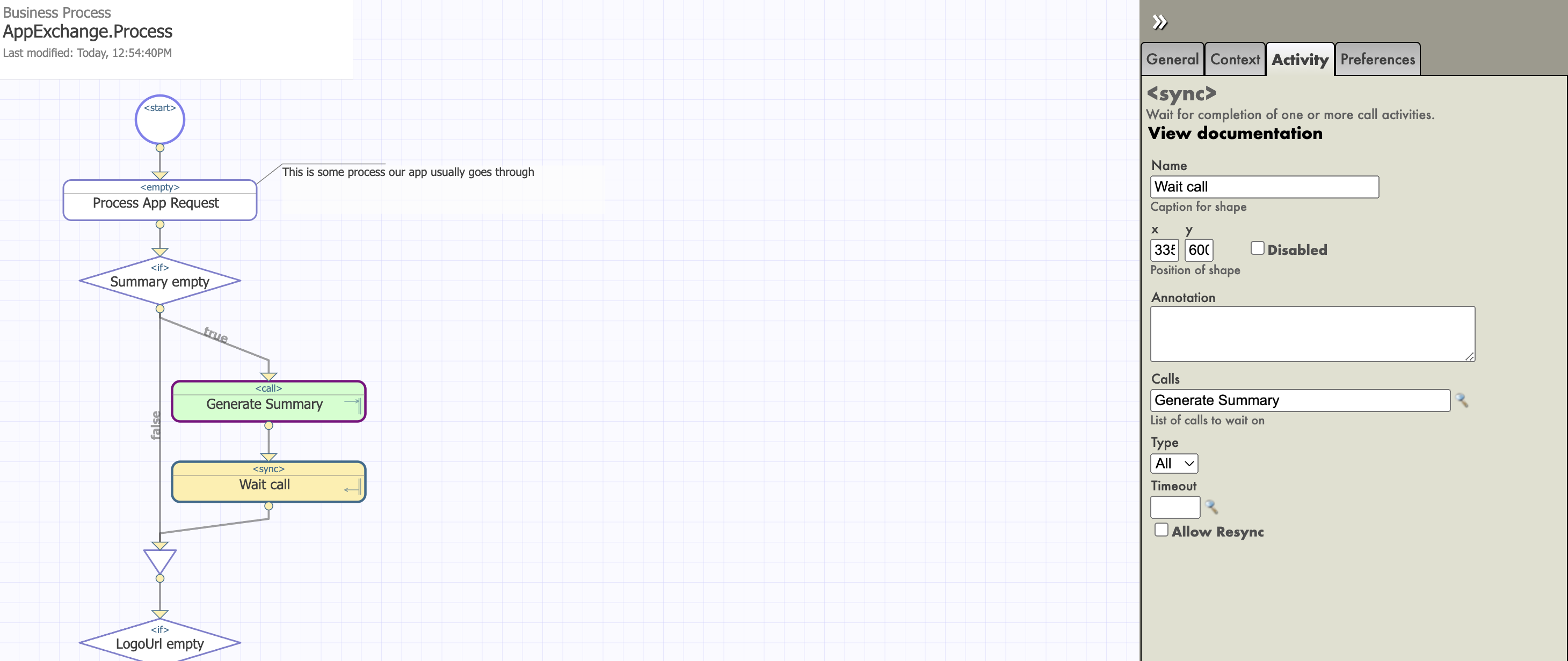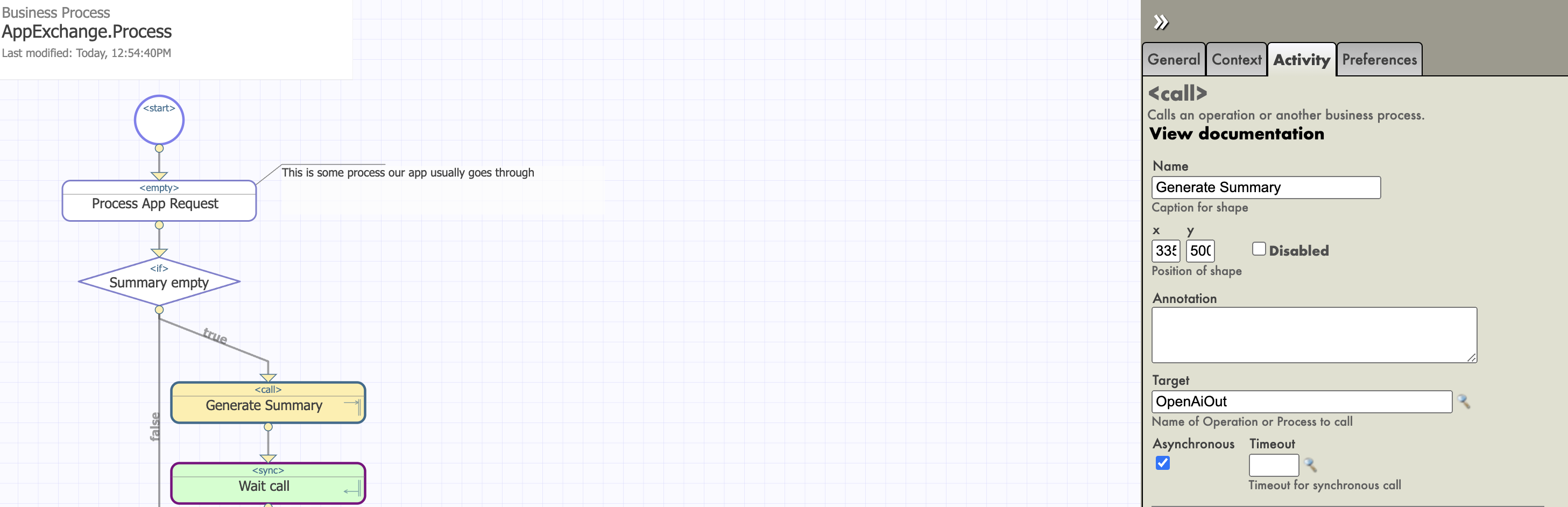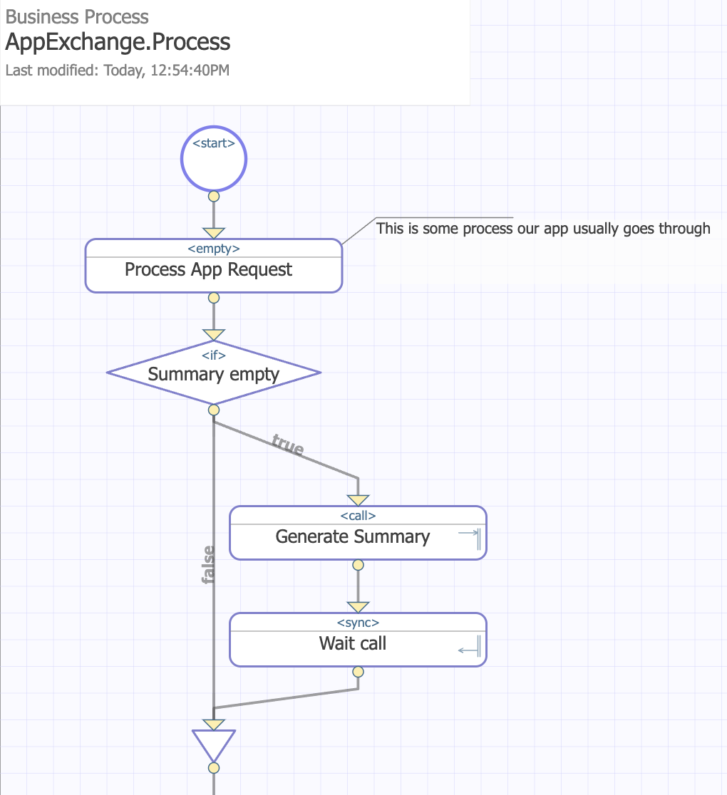 Vaya a Interoperability > Business Process Designer y abra el proceso de negocio AppExchange.Process haciendo clic en Open.