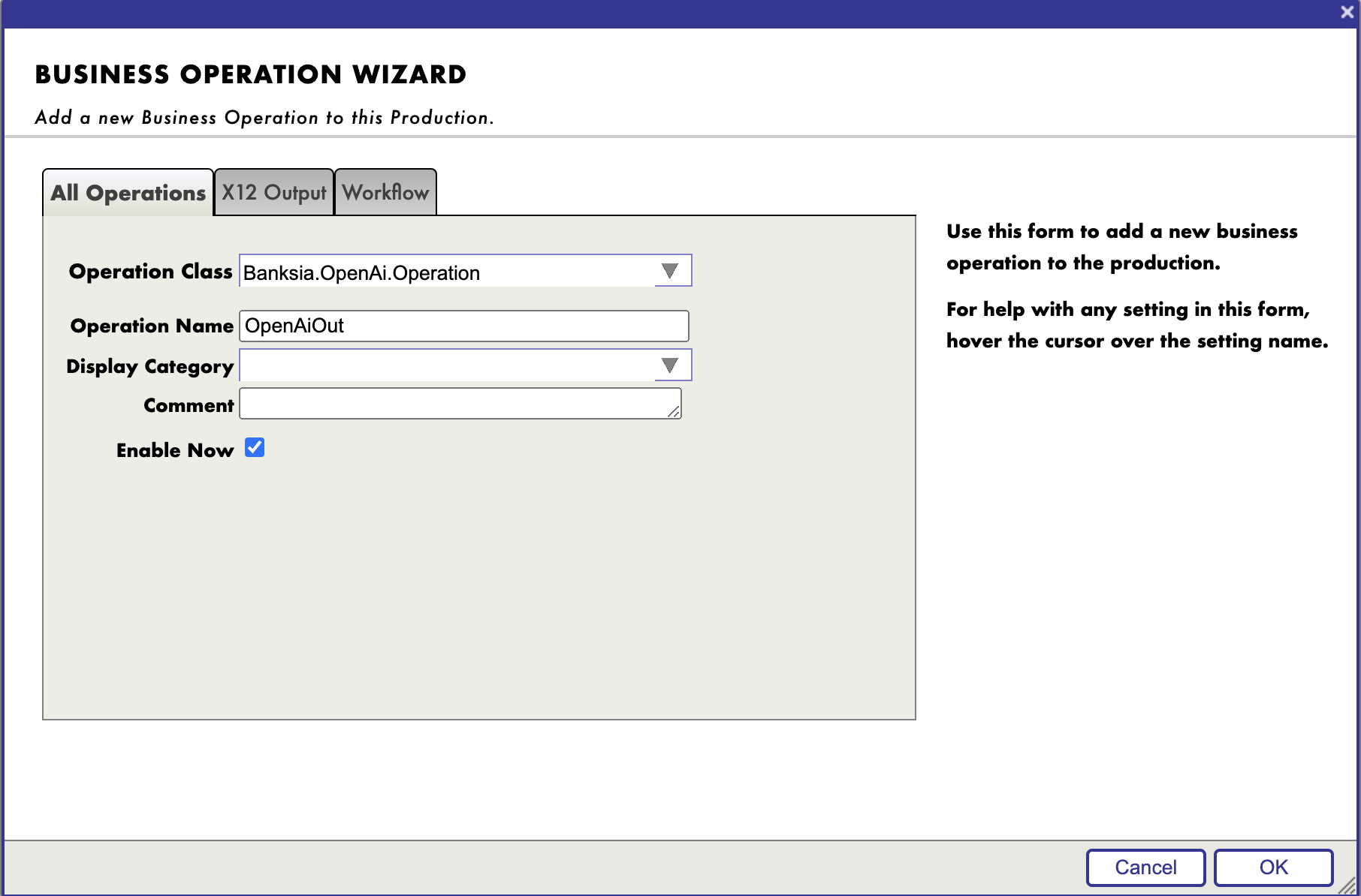 Añade una nueva operación basada en la clase Banksia.OpenAi.Operation y nómbrala OpenAiOut. Habilítala. Esta operación se comunicará con los servidores de la API OpenAI.