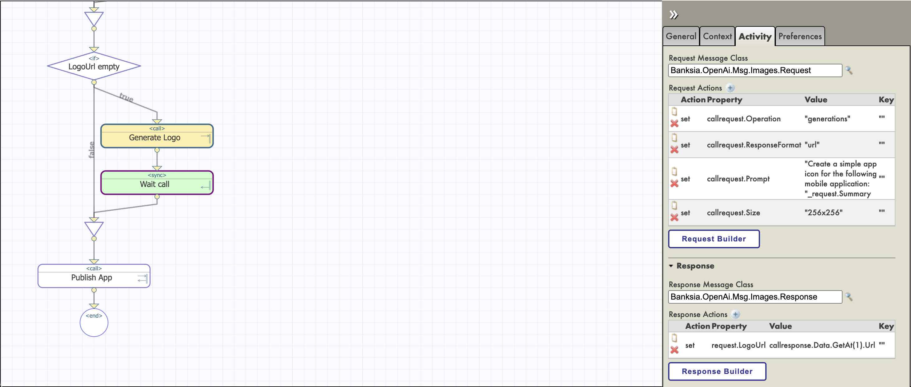 A continuación, agregue el bloque <Сall> y haga un OpenAiOut de destino, que, dependiendo del tipo de solicitud, hará una llamada a OpenAi api.
