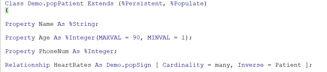 1. Al principio, creé 2 clases persistentes para admitir la Utilidad de Población (Extends (%Persistent, %Populate)): popPatient que tiene como objetivo completar la información de los pacientes, popSign para simular los datos recopilados de un sensor de frecuencia cardíaca en el paciente.