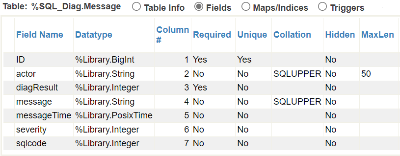 A continuación se muestra la estructura de la tabla %SQL_Diag.Message