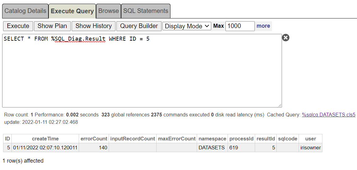 Para obtener los detalles, necesitamos obtener el ID máximo de la tabla %SQL_Diag.Result después de la operación LOAD DATA.