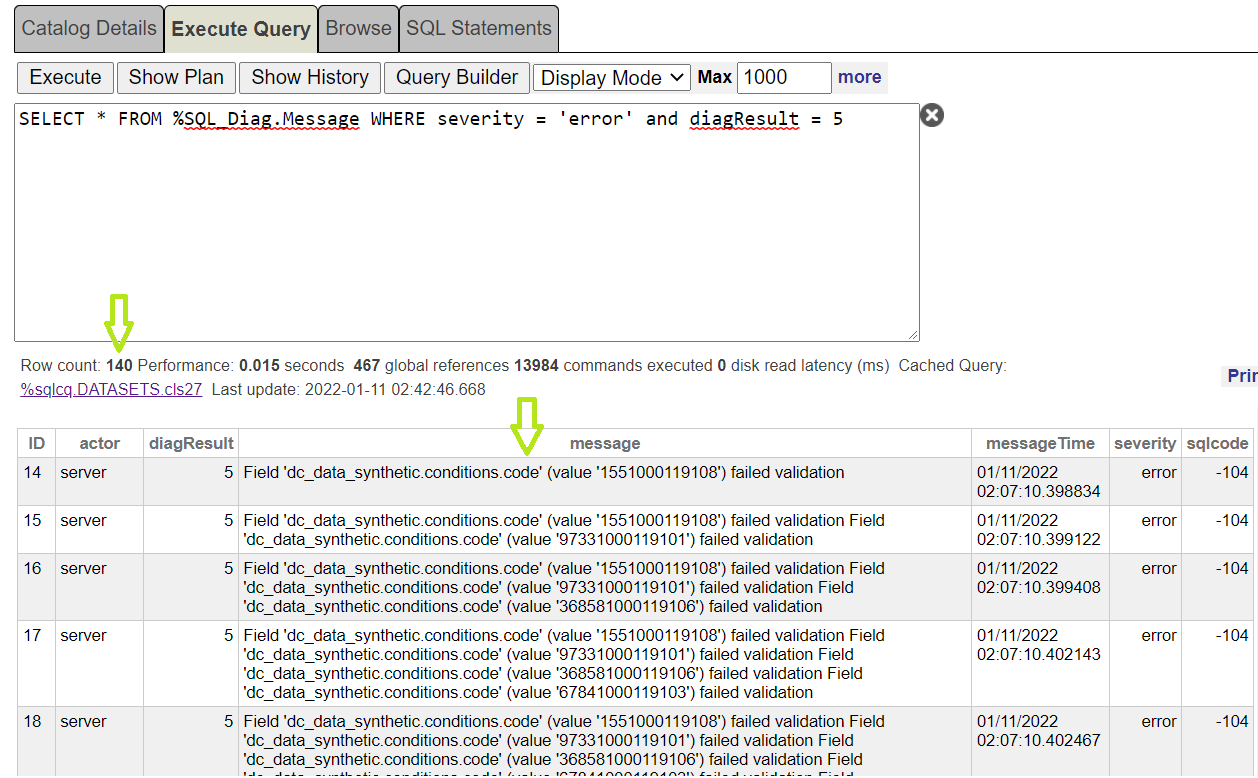 Estos errores se pueden ver en la tabla %SQL_Diag.Message usando %SQL.Diag.Result ID contra la columna %SQL_Diag.Message diagResult.