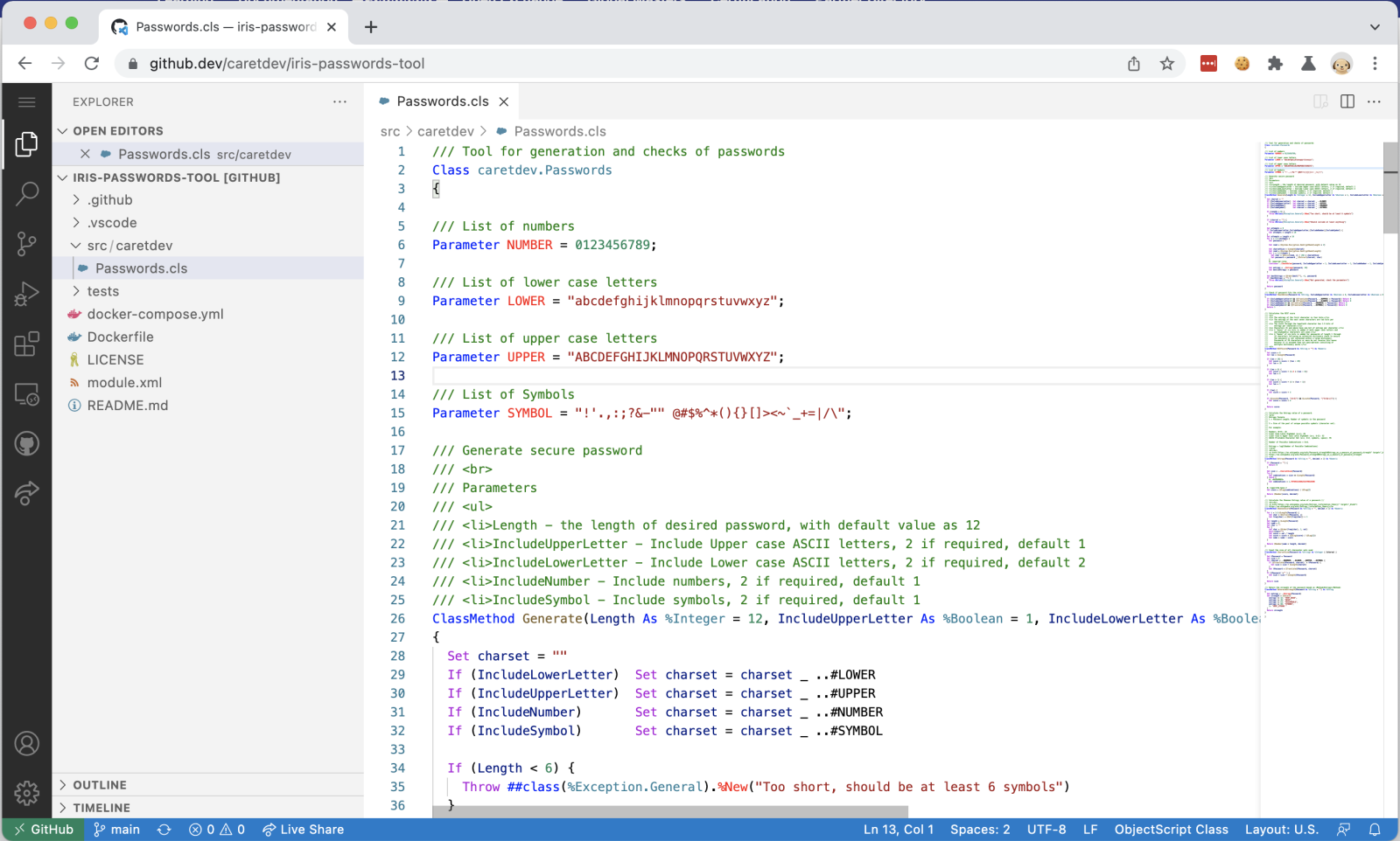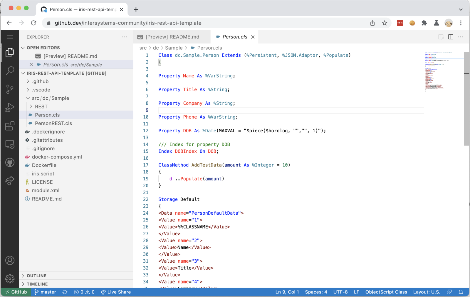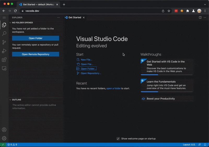 Hay una opción más, si quieres ejecutar VSCode en navegador, pero no vinculado a ningún repositorio GitHub, y sólo abrir algunos de tus archivos locales, puedes utilizar https://vscode.dev. La extensión VSCode-ObjectScript está disponible allí también.
