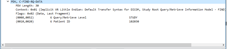 Context: 0x01 (Implicit VR Little Endian: Default Transfer Syntax for DICOM, Study Root Query/Retrieve Information Model - FIND)
