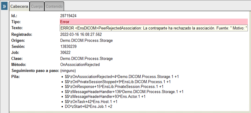 > ERROR <EnsDICOM>PeerRejectedAssociation: La contraparte ha rechazado la asociación. Fuente: '%1' Motivo: '%2'