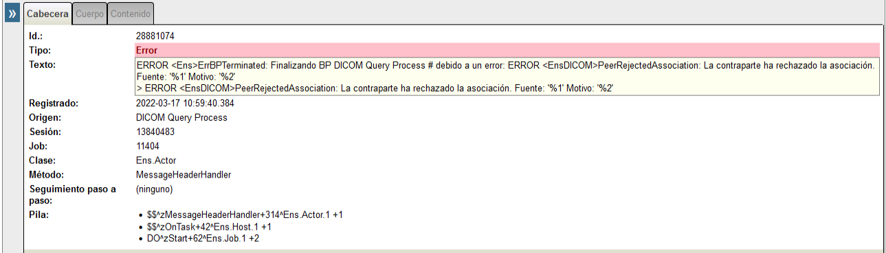 ERROR <Ens>ErrBPTerminated: Finalizando BP DICOM Query Process # debido a un error: ERROR <EnsDICOM>PeerRejectedAssociation: La contraparte ha rechazado la asociación. Fuente: '%1' Motivo: '%2'