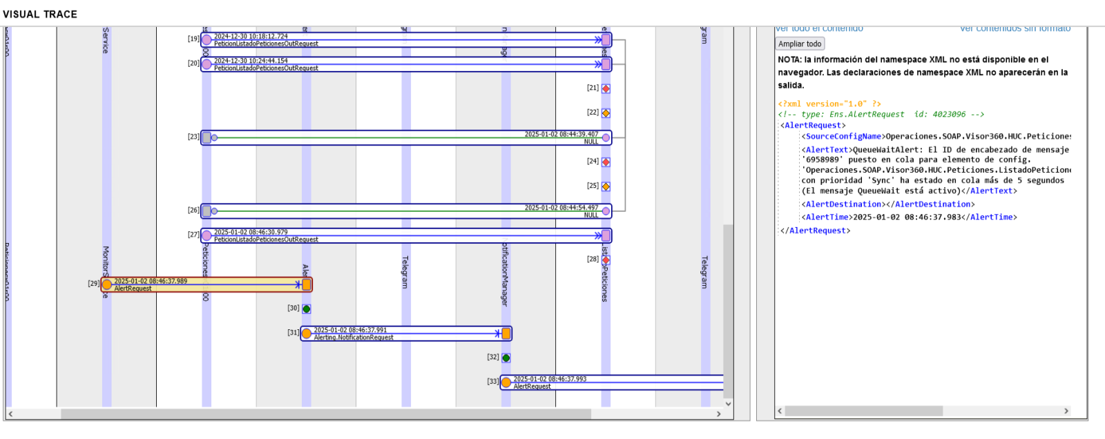 Con la anterior configuración en la Operación, al reenviar los mensajes, se encolan, y se ve la Alerta generada: